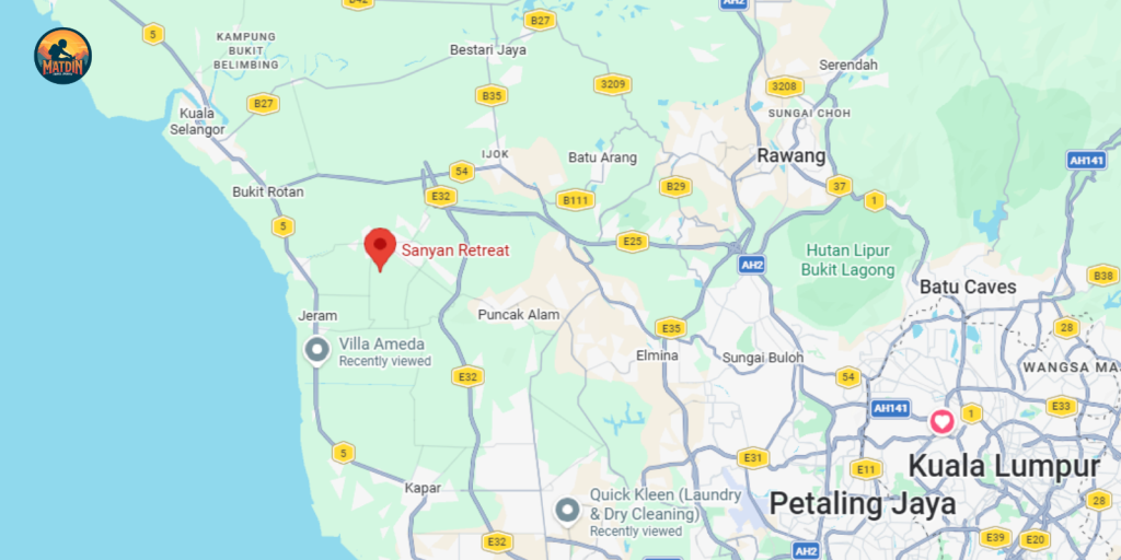 Sanyan Retreat terletak di kawasan Bukit Kuching, Jeram, Selangor sebuah kawasan yang agak terpencil namun mudah dicapai. Dari Kuala Lumpur, perjalanan mengambil masa lebih kurang 45 hingga 60 minit bergantung kepada trafik, menjadikannya destinasi sempurna untuk percutian hujung minggu tanpa perlu membuang masa terlalu lama di jalan raya.