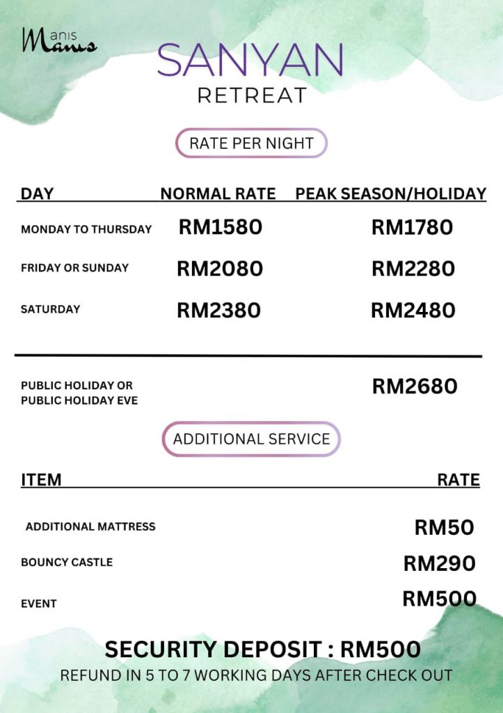 Bagi rombongan antara 18 hingga 40 orang, nilai yang ditawarkan oleh Sanyan Retreat adalah sangat berpatutan jika dikira secara per kapita. Bayangkan anda mendapat kolam renang peribadi, bilik permainan lengkap, dua dapur, enam bilik tidur, dan pelbagai kemudahan lain — semuanya dalam satu harga sewaan villa.
